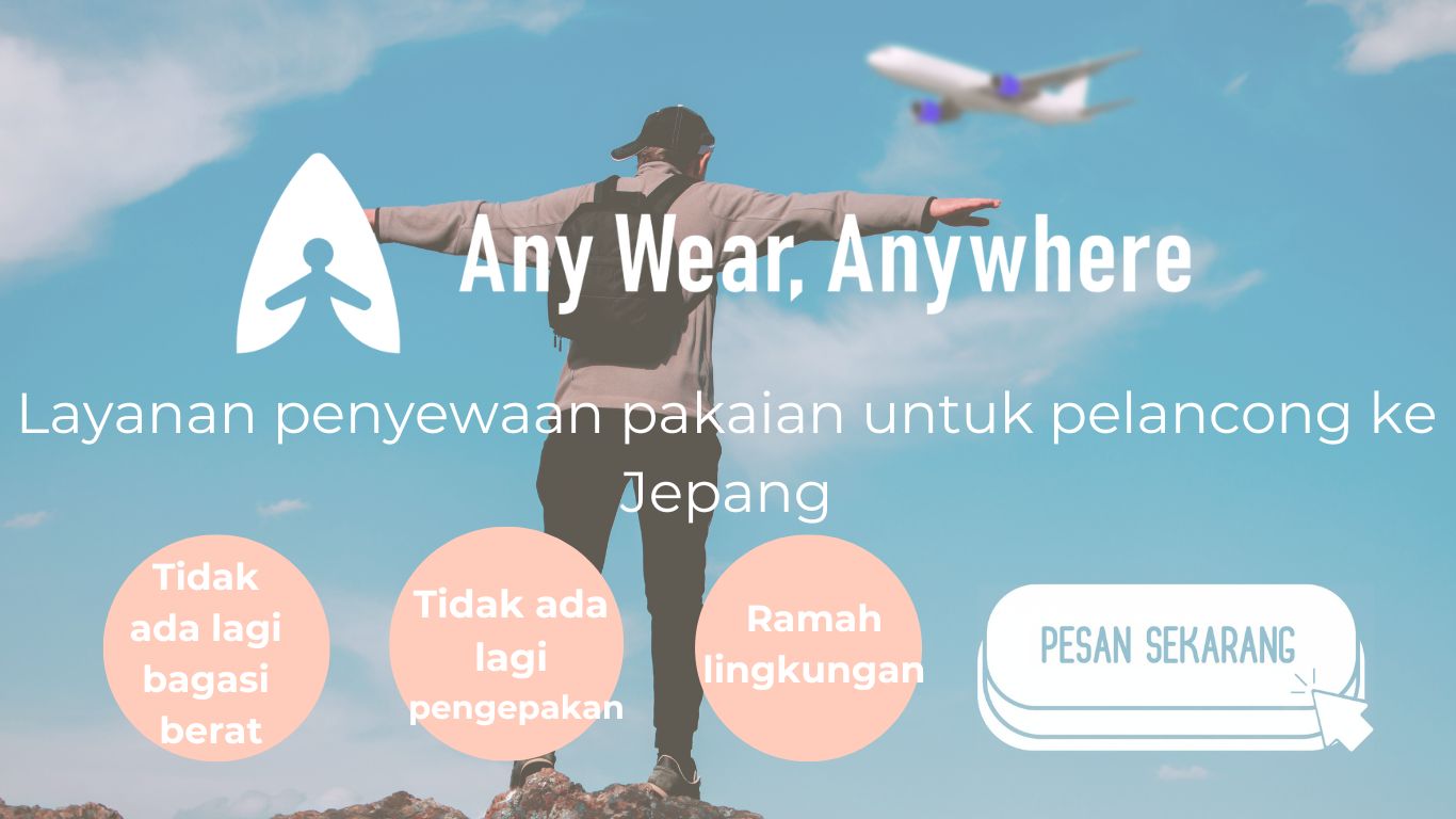 Any Wear, Anywhere is a clothing rental service for people who will travel to Japan . Our service eliminates the need to pack, bring, or wash your own clothes. Through our service, you can also reduce your carbon footprint.