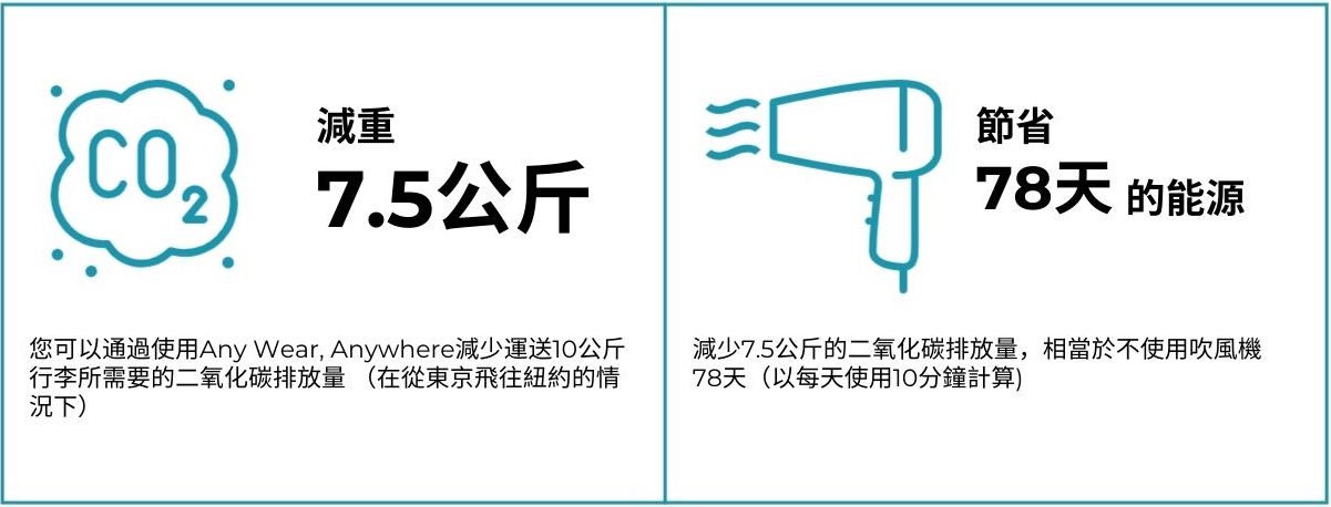 Any Wear, Anywhere can reduce fuel and CO2 emissions from airplanes by reducing the amount of cargo carried. In addition, our service can extend the life of clothes by renting out clothes originally destined for disposal.
