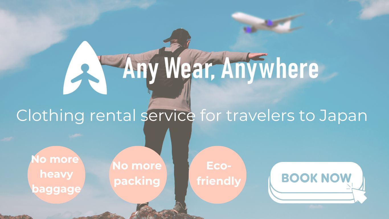 Any Wear, Anywhere is a clothing rental service for people who will travel to Japan . Our service eliminates the need to pack, bring, or wash your own clothes. Through our service, you can also reduce your carbon footprint.